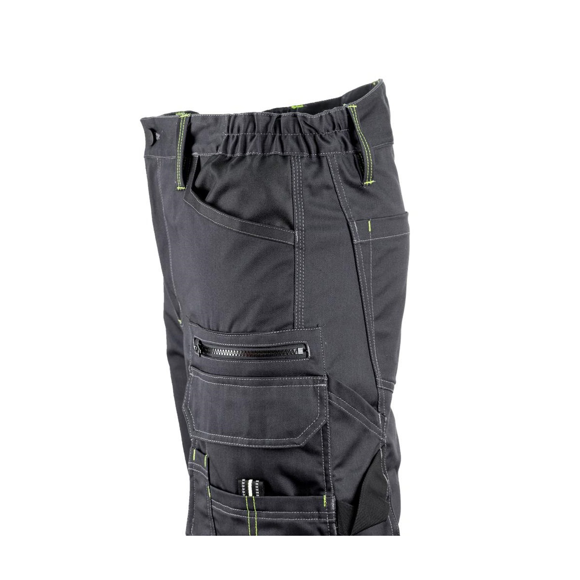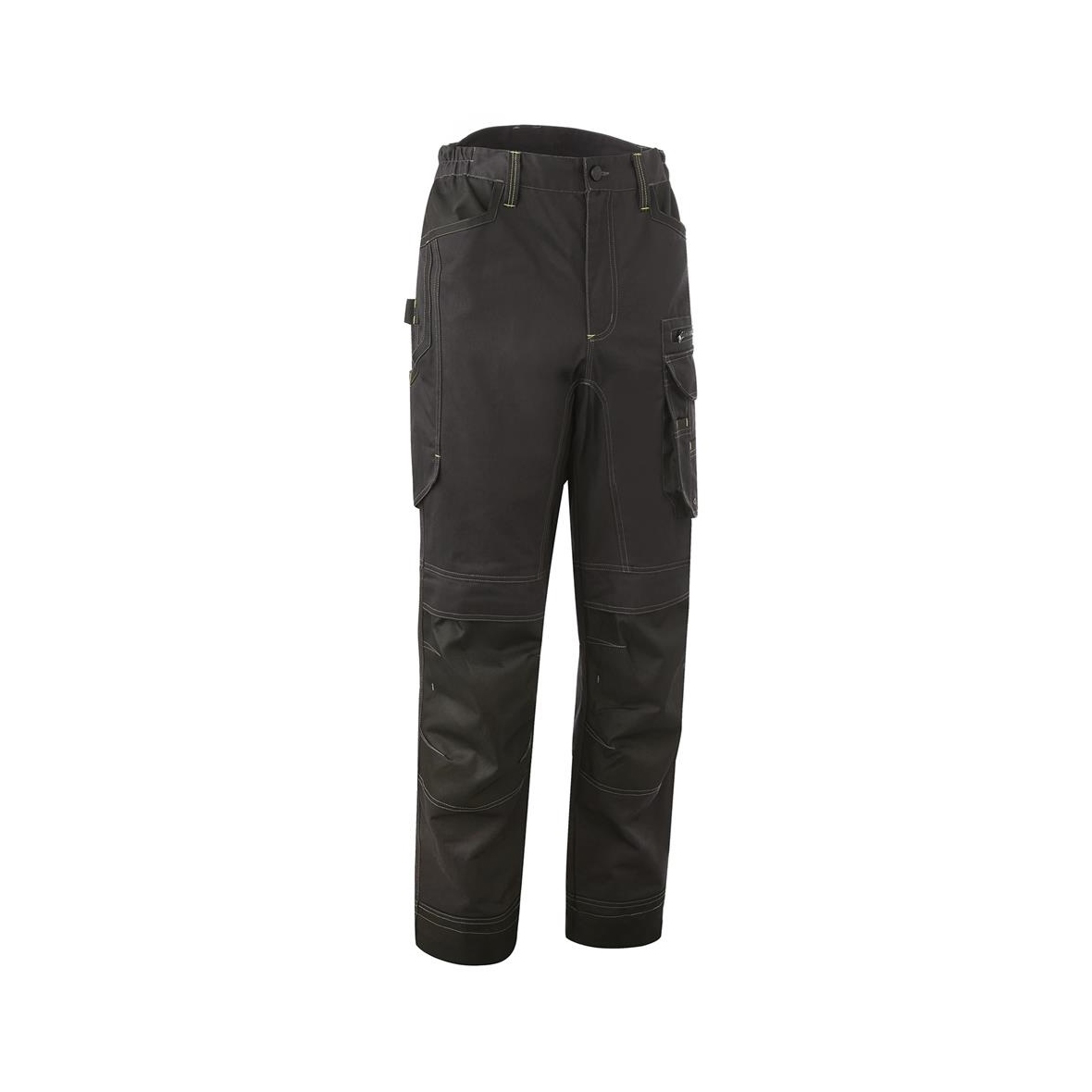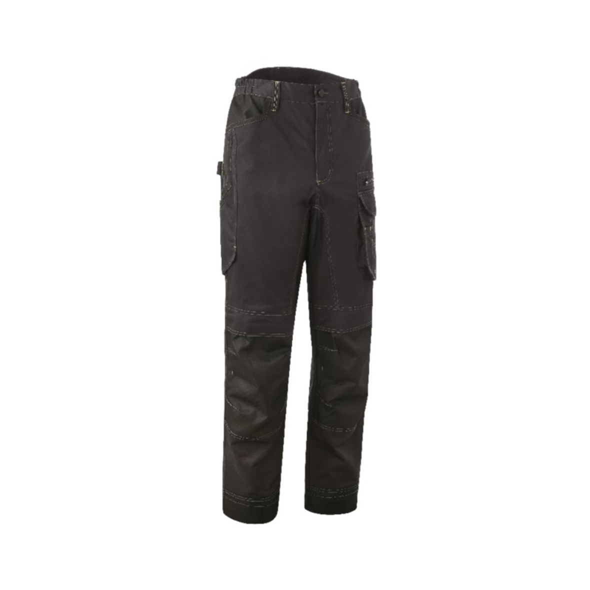 270 g/m2 vastag, 60% pamut + 40% poliészter sávolykötésű kevertszálas antracit színű alapanyag,kopásálló Oxford PES betétekkel megerősített részek: térd, lábszár alja, zsebeknél, regular szabású, divatos formai kialakítás díszvarrással,