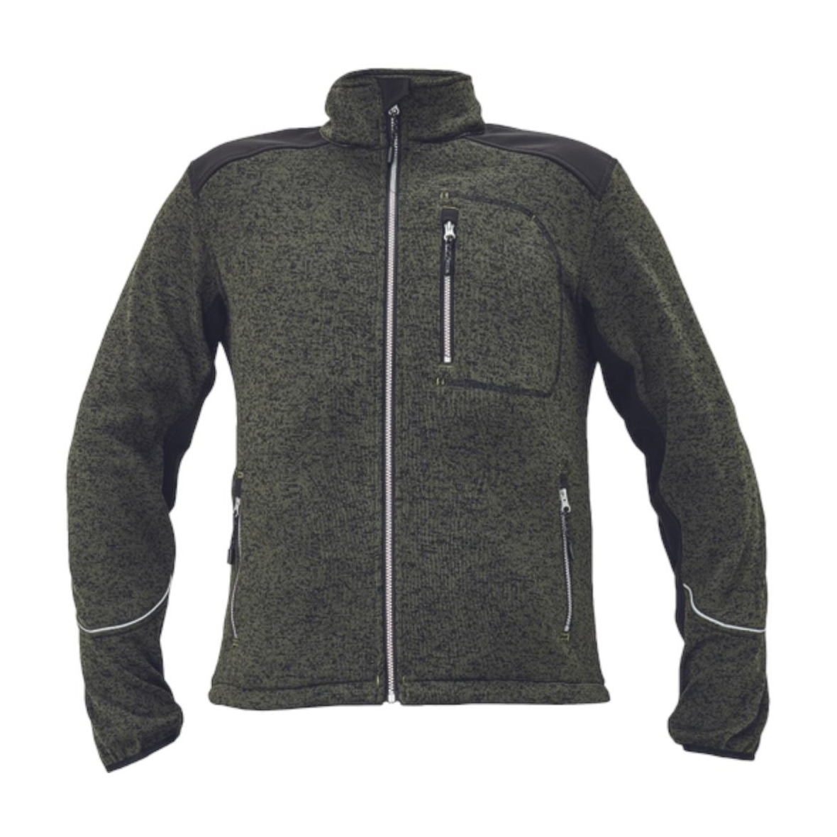férfi cipzáras kardigán kötött, melírozott textilből, belül fésült, puha felület, kontrasztos softshell erősítésekkel a vállakon és az ujjakon, 1 cipzáras mellzseb, 2 cipzáras oldalzseb, a kabát alja zsinórral szűkíthető, dekoratív fényvisszavető szegély, hüvelykujj bújtató