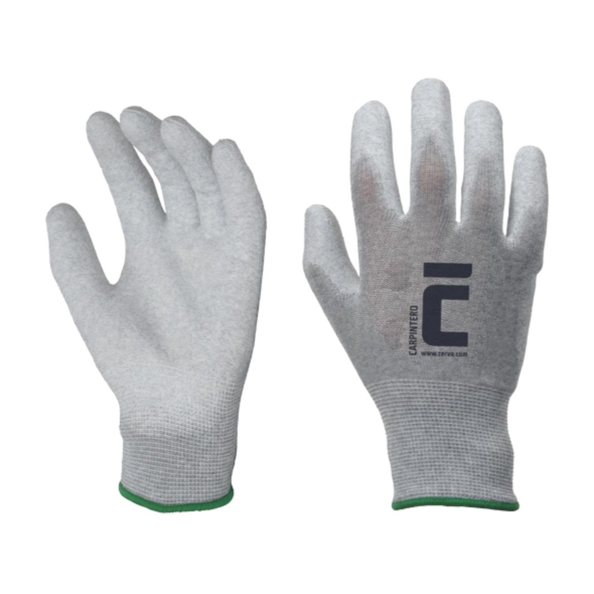 Kötött, varrat nélküli antisztatikus poliészter kesztyű, integrált szénszállal, poliuretán réteggel a tenyéren és az ujjakon, valamint rugalmas mandzsettával.
