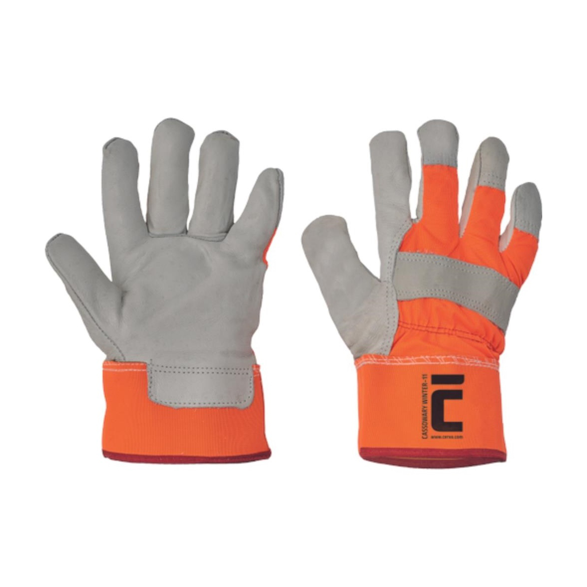 Melegen bélelt kombinált kesztyű, tenyér marha színbőr, kézfej poliészter szövet, merev mandzsetta, figyelemfelkeltő sárga és narancs színekben.