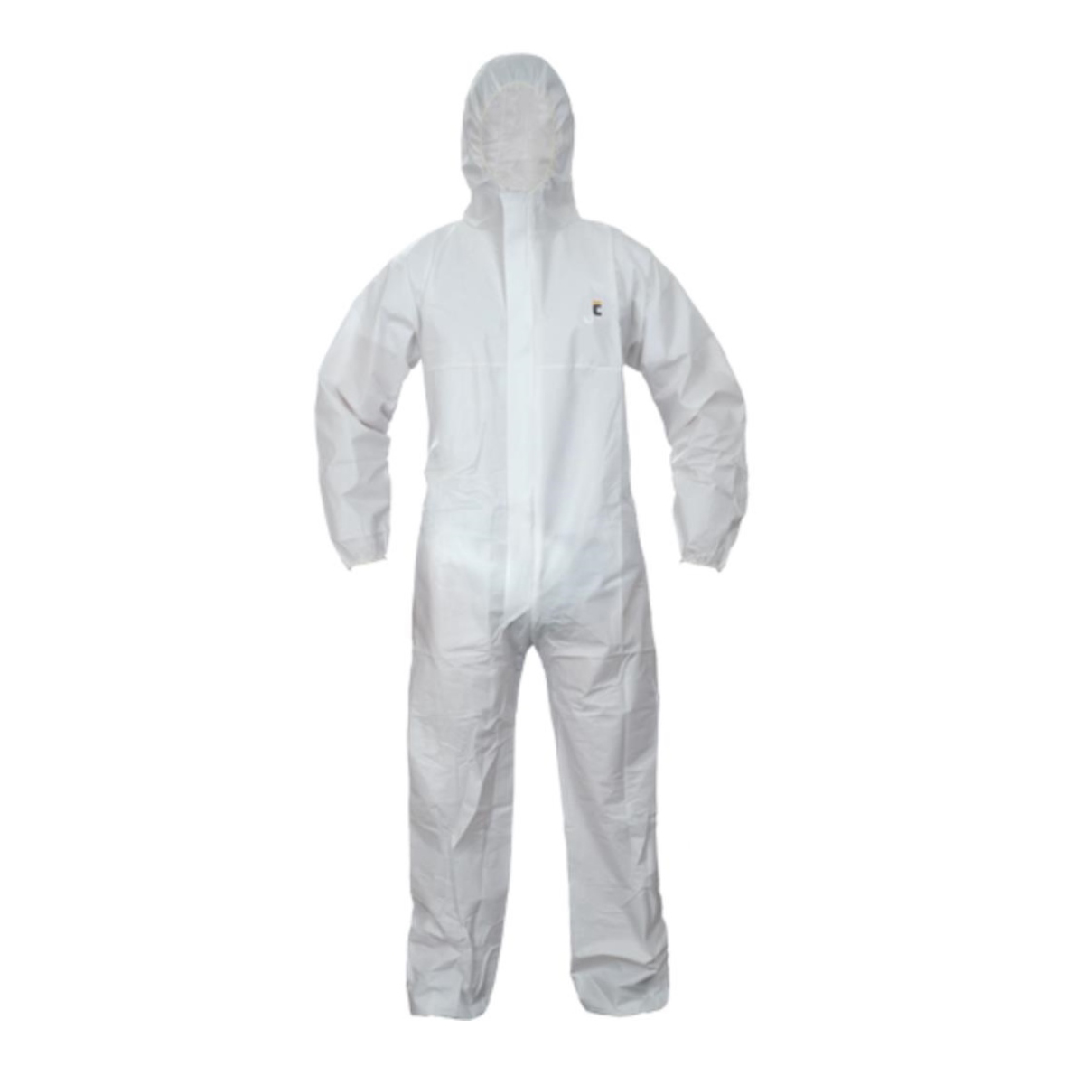 antisztatikus védőoverál kapucnival; az overál első része mikroporózus anyagból készült, a hátsó része kék SMMS anyagból, amely rendkívül légáteresztő; a légáteresztő képessége rendkívül komfortossá teszi a viselését munka közben; a mandzsettán hurok található a hüvelykujj számára, így biztosítva a tökéletes illeszkedést