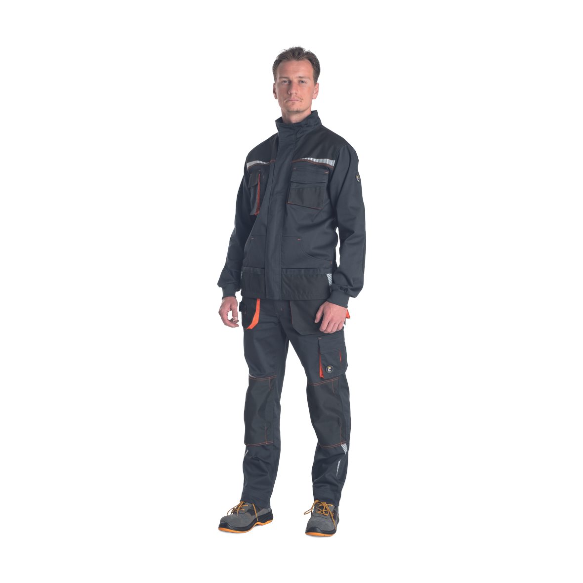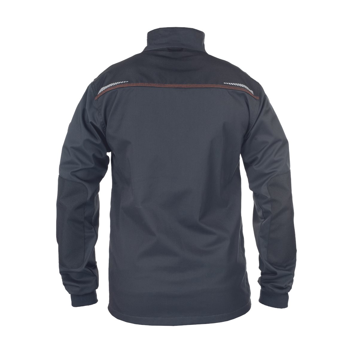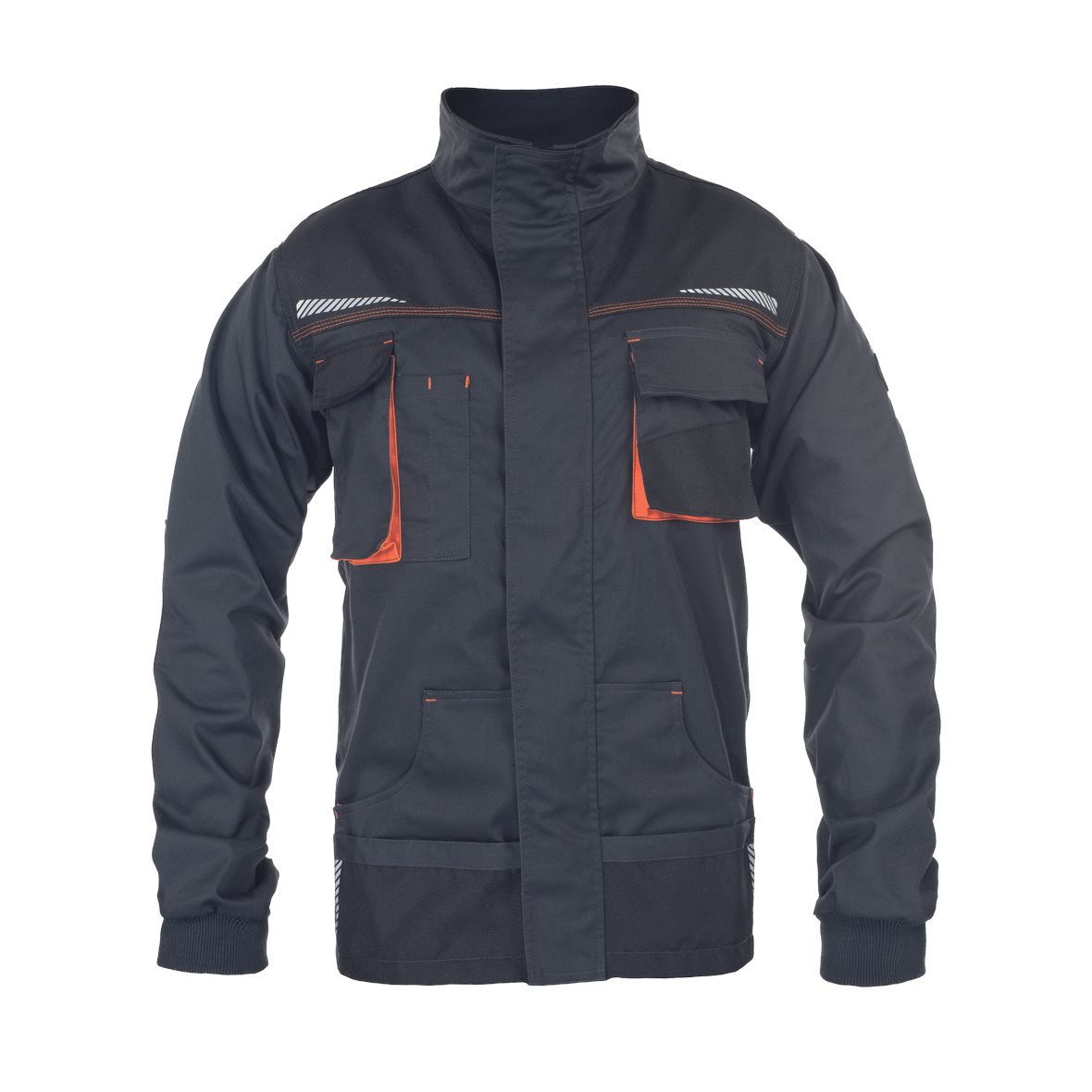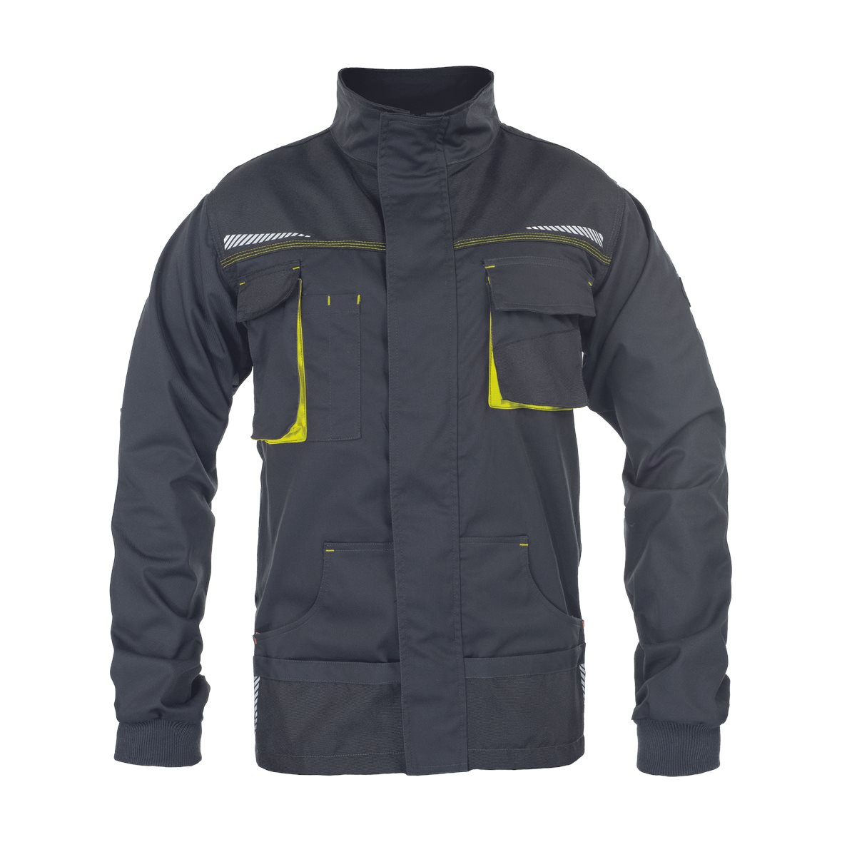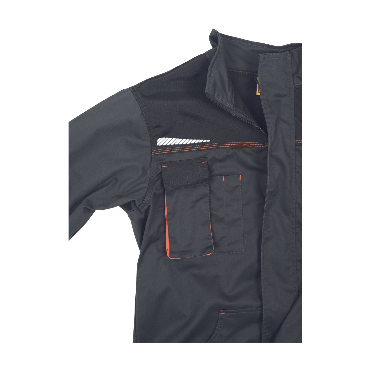 • men’s work jacket made of highly durable stretch fabric • front zip closure with protective placket • 2 side pockets • 2 chest pockets, including one for a cell phone • Oxford 600D reinforced shoulder and elbow areas • printed reflective segment details • knitted elastic sleeve cuffs