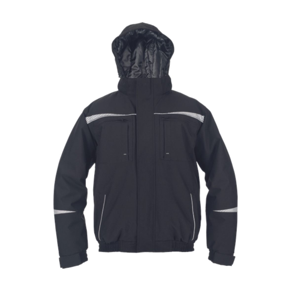 Vízálló téli pilótadzseki levehető, bélelt kapucnival. A dzseki cipzárral záródik, amelyet kívülről tépőzárral rögzíthető fedés borít. Két cipzáras oldalzsebbel, két mellzsebbel és két belső zsebbel rendelkezik. Ujjain rugalmas mandzsetta, alján rugalmas kötött szegély található. Fényvisszaverő részletei fokozzák a láthatóságot.