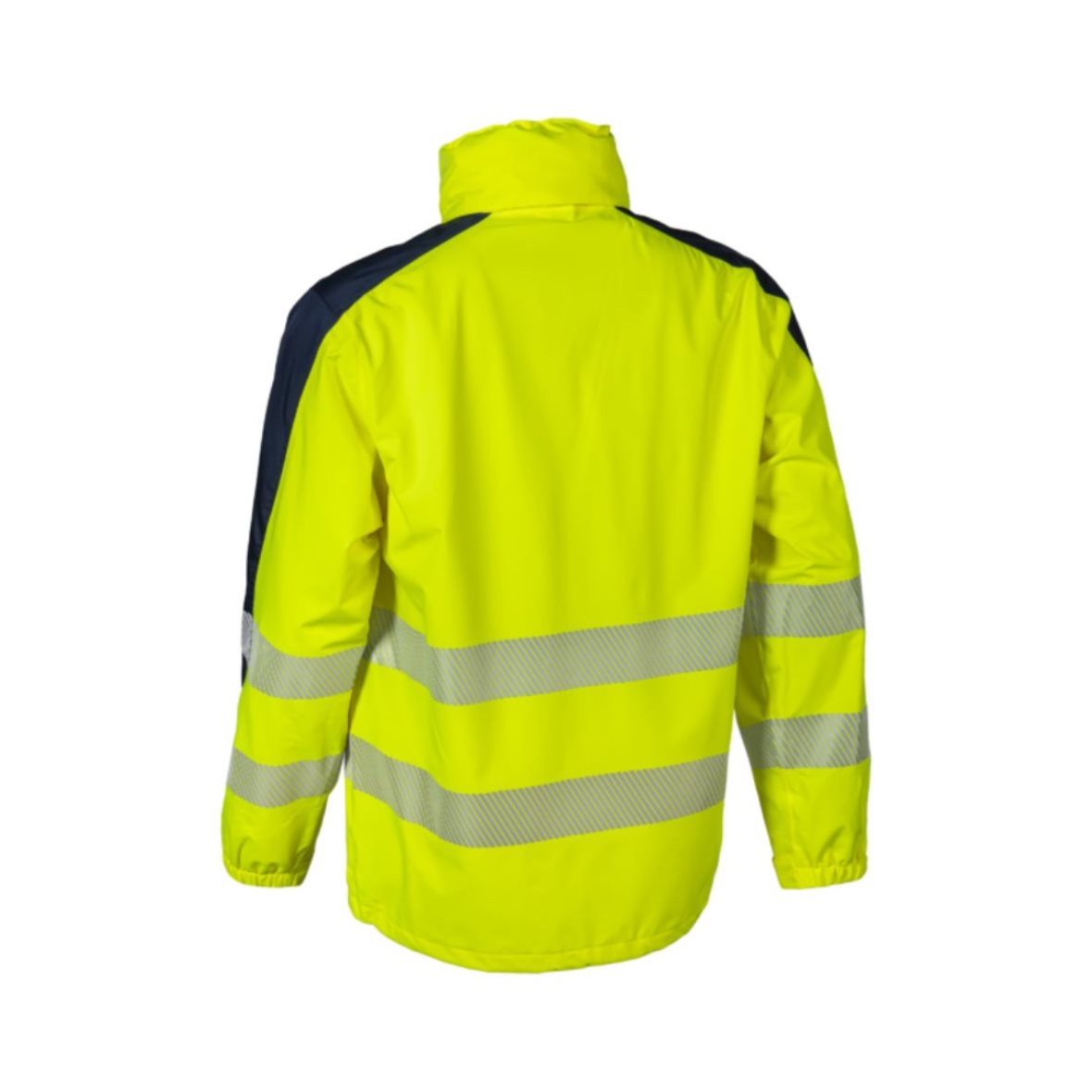 * 5 cm széles szegmentált fényvisszaverő csík: 2 a test körül, 2 a karon, álló gallér végéig futó, tépőzárral, fedett cipzár