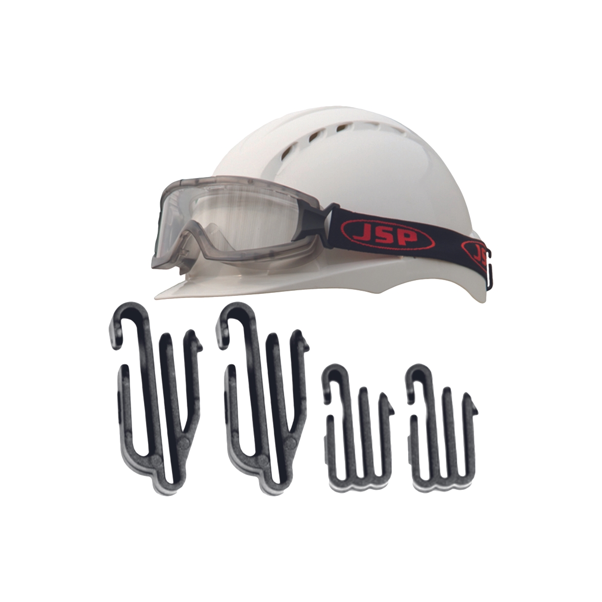 4 darabos csiptetőcsomag fejlámpák és védőszemüvegek biztonságos rögzítésére EVO2®, EVO3®, EVO6100® és EVOlite® védősisakokhoz.