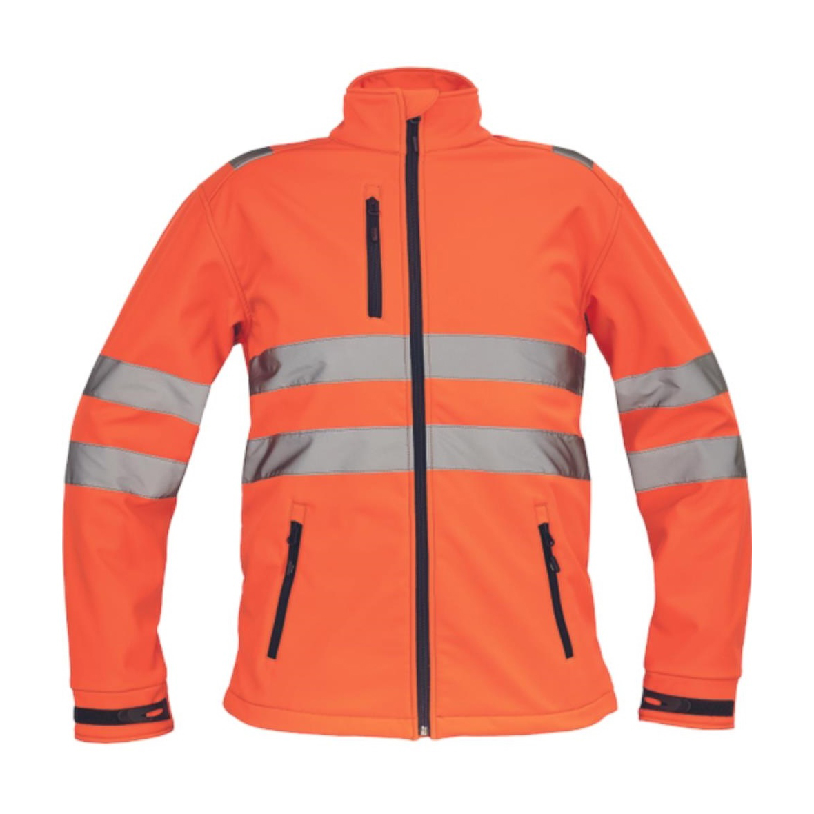Hi-Vis férfi softshell kabát TPU membránnal, 5cm vastag fényvisszavető csíkok az ujjakon és a testen, cipzáras, 1 mellkasi és 2 oldalsó zseb, tépőzárral szűkíthető ujjvégek, a pulóver alsó részén húzózsinór
