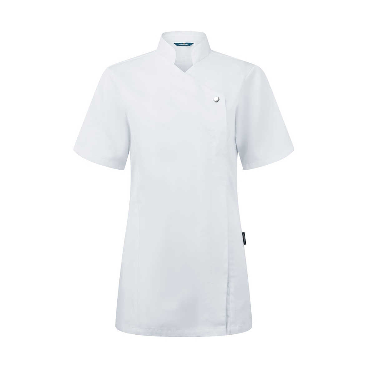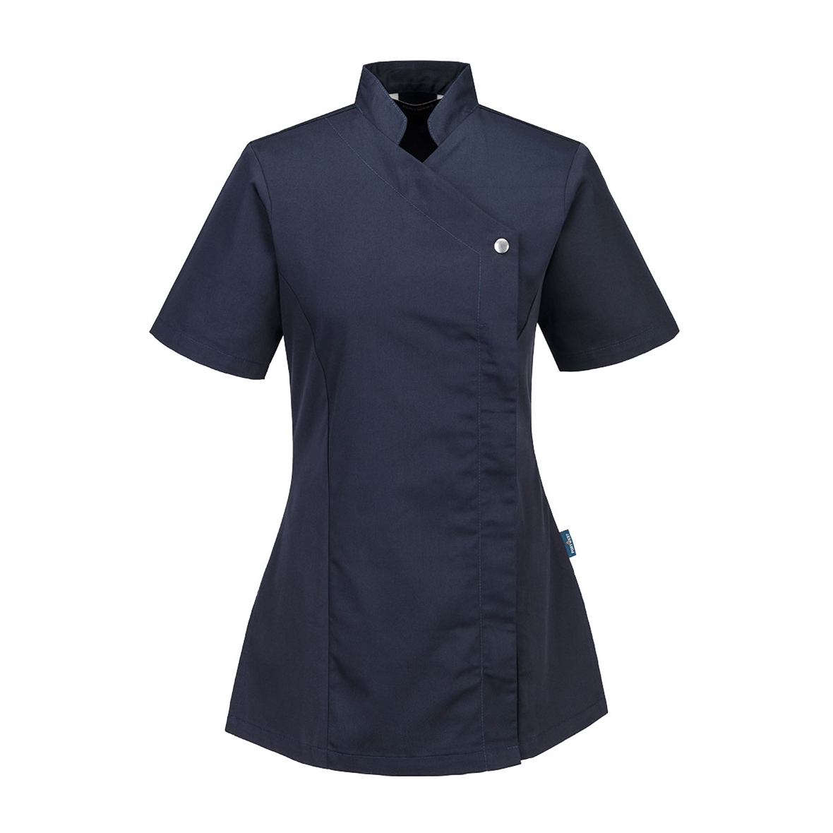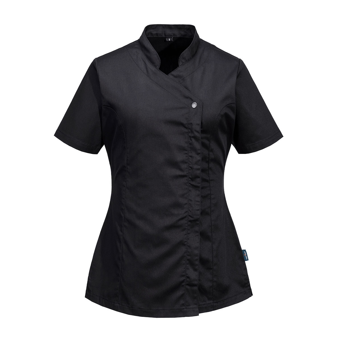 Ez a női tunika elöl patentos, rejtett cipzárral záródik. Az oldalsó sztreccs anyag használata a könnyű mozgás érdekében, valamint az oldalsó szellőzőnyílások és a fekete redő teszi ezt a ruhadarabot praktikussá, miközben megtartja a stílust.