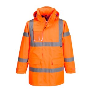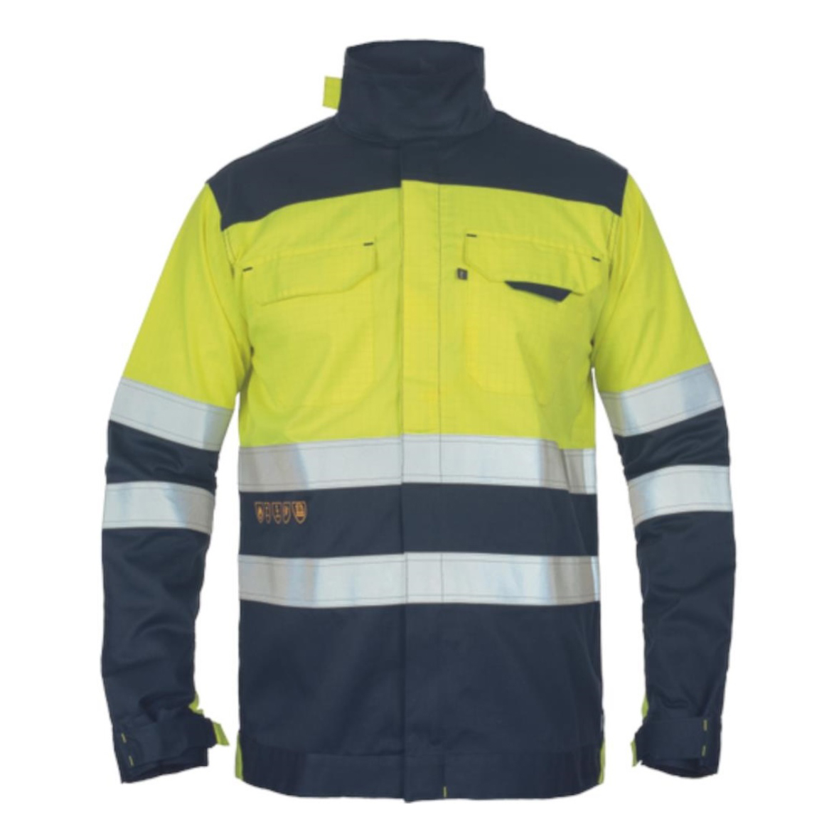 HI-VIS multinorm munkakabát cipzárral záródó kialakításban, tépőzáras hajtókával. Állógalléros kivitel, 2 hajtókás mellzsebbel, szűkíthető mandzsettával. A derékrészen és az ujjakon 5 cm-es rávarrt fényvisszavető csíkokkal van ellátva.