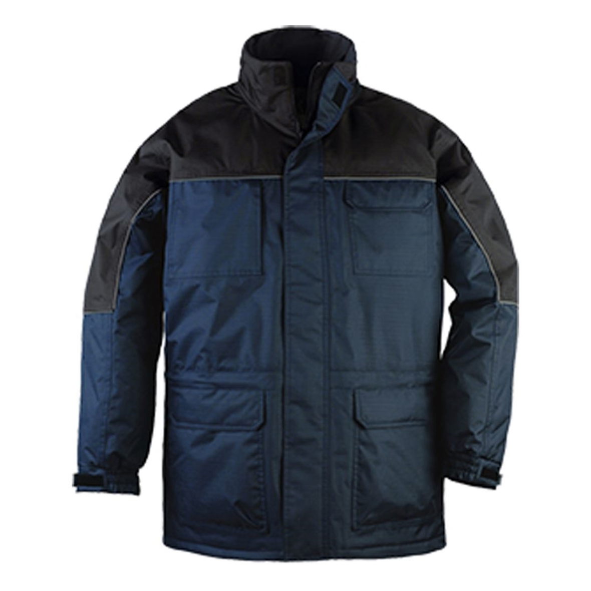 RIPSTOP SÖTÉTKÉK/FEKETE KABÁT: • szakadásbiztos, Ripstop rácsos szerkezetű, PVC-vel vízhatlanított poliészter alapanyag • 280 g/m² polárbélés, alul poliamid vesevédő résszel • körbefutó fényvisszaverő díszcsík • gallérba rejtett kapucni • hat külső, egy belső zseb • végig cipzár plusz tépőzár • állítható csukló-, alj- és derékbőség • szín: sötétkék/fekete (5RIPB) • méret: L • EU szabvány: EN ISO 13688, EN343: 1.1, EN14058: 3.3.X.X.X