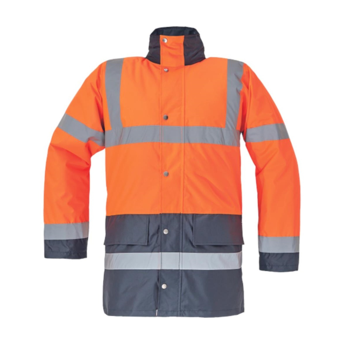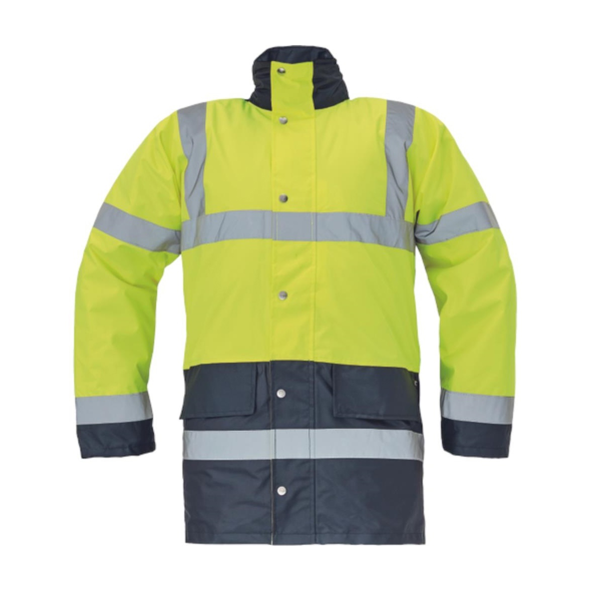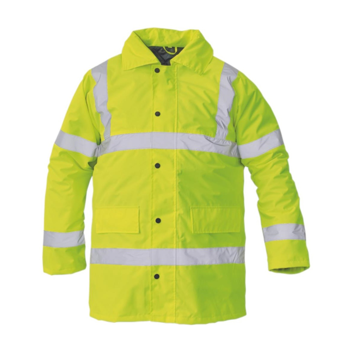 Bélelt és vízhatlan jólláthatósági dzseki az EN 471 szabványnak megfelelő láthatósággal, páraáteresztő PU réteggel, gallérba rejtett kapucnival, az EN 343 szabvány szerinti 3. osztályú vízállósággal és az EN 343 szabvány szerinti 1. osztályú páraáteresztő képességgel.