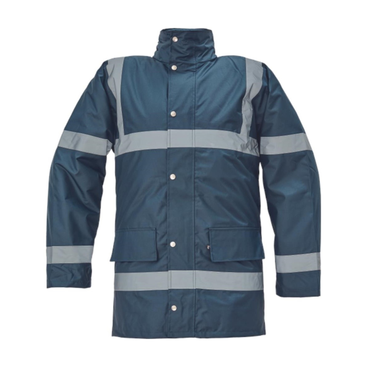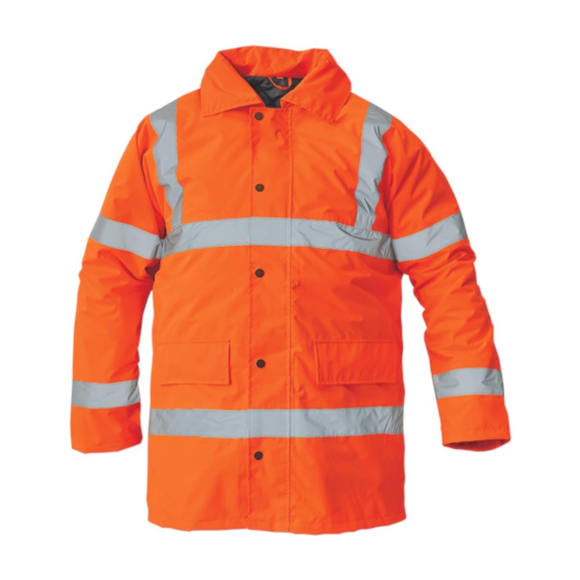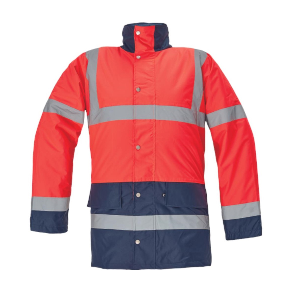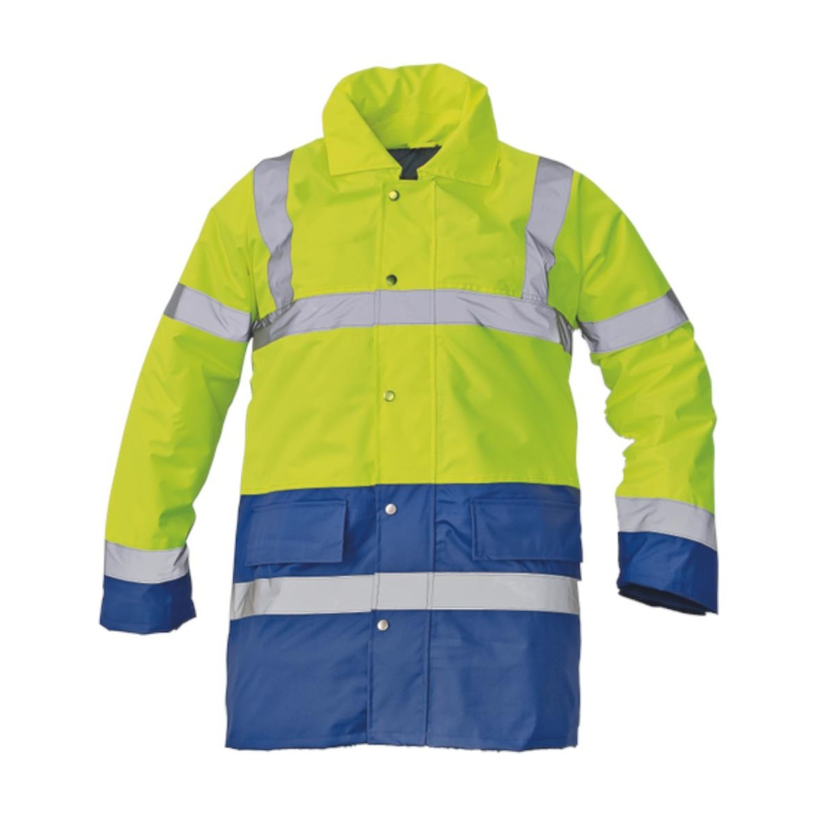Bélelt és vízhatlan jólláthatósági dzseki az EN 471 szabványnak megfelelő láthatósággal, páraáteresztő PU réteggel, gallérba rejtett kapucnival, az EN 343 szabvány szerinti 3. osztályú vízállósággal és az EN 343 szabvány szerinti 1. osztályú páraáteresztő képességgel.