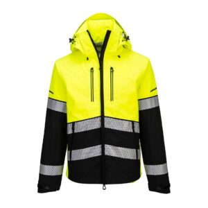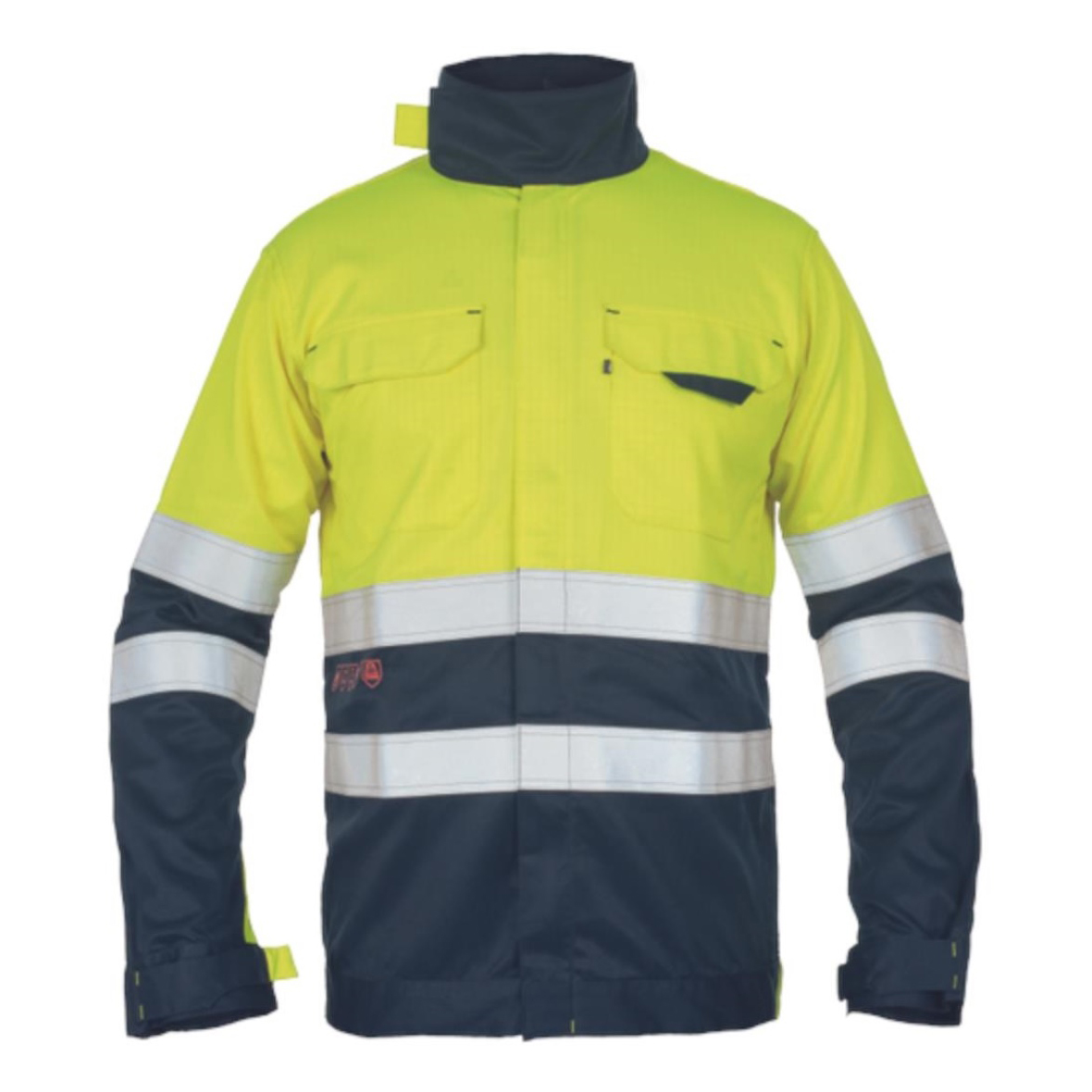 HI-VIS multinorm munkakabát cipzárral záródó kialakításban, tépőzáras hajtókával. Állógalléros kivitel, 2 hajtókás mellzsebbel, szűkíthető mandzsettával. A derékrészen és az ujjakon 5 cm-es rávarrt fényvisszavető csíkokkal van ellátva.