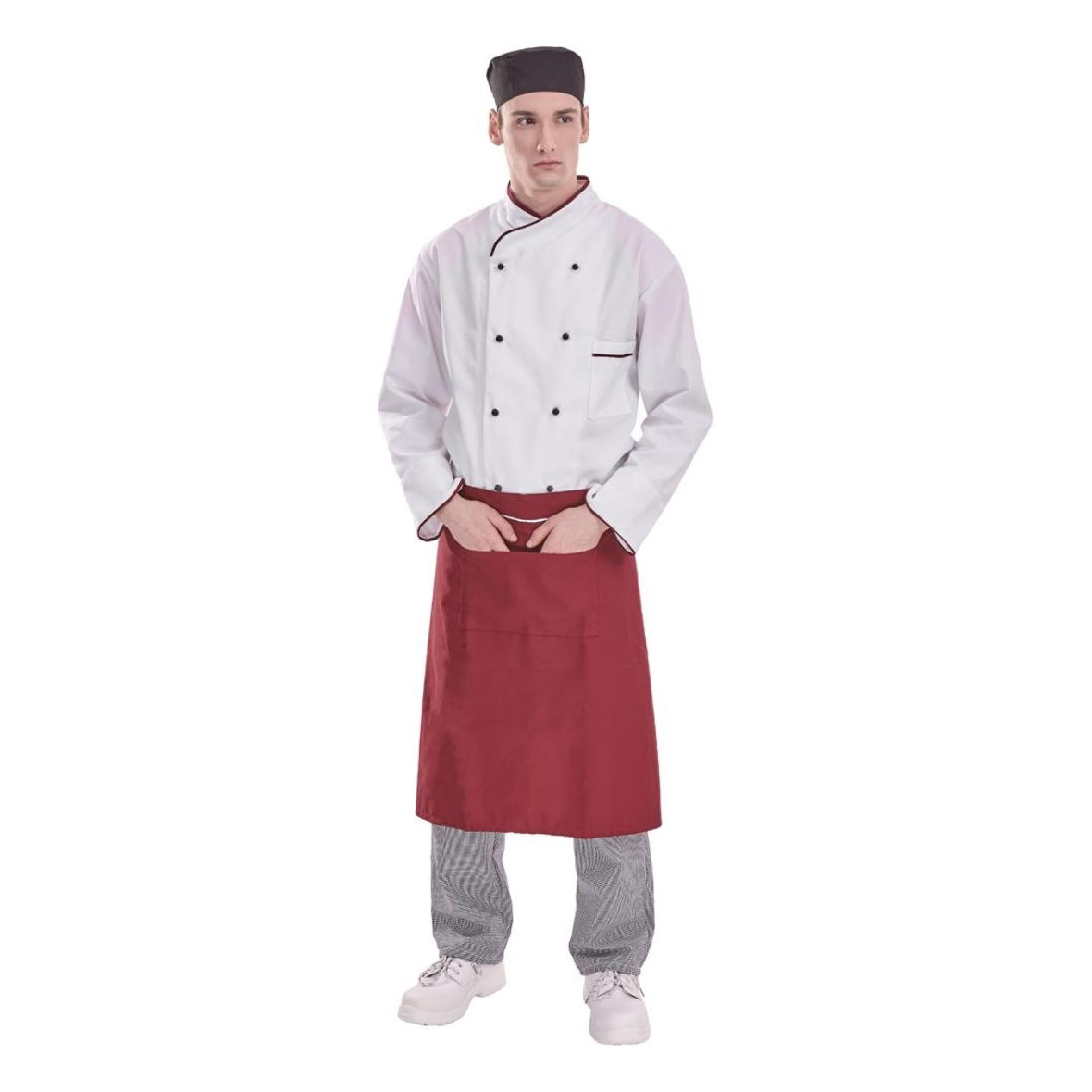 SZAKÁCSKABÁT HOSSZÚ UJJÚ, BORDÓ SZEGÉLYES: • 245 g/m² vastag, lánckötésű, 65% poliészter, 35% pamut alapanyag • klasszikus fazonú, magasan szabott, fehér színű • kétsoros, cserélhető gombolás, visszahajtható mandzsetta, rávarrt mellzseb, díszcsíkkal • kiválóan szellőző, mérettartó modell • álló gallér, uniszex, átgombolható kivitel • hosszú ujjú, bordó szegélyes kivitel • méret: S • EU szabvány: EN340