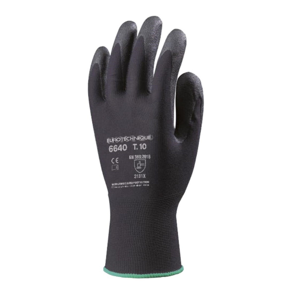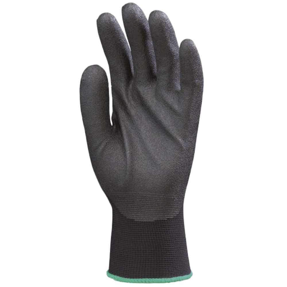 HYDROPELLENT HABOSÍTOTT FEKETE PVC MÁRTOTT KESZTYŰ: • kötött, rugalmas, nagy szakítószilárdságú, fekete, 100% poliészter szál • tenyéren csúszásbiztos, habosított fekete PVC mártás • nedvességálló, vízlepergető Hydropellent™ felület • gumírozott, rugalmas mandzsetta, szellőző kézhát • méret: 7-es • csomagolás: 100/10 • EU szabvány: EN420, EN388: 4131