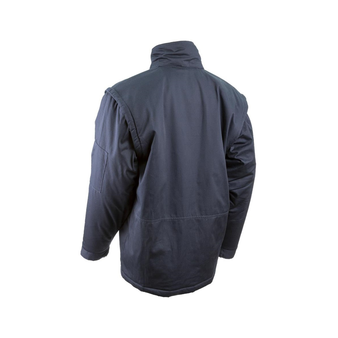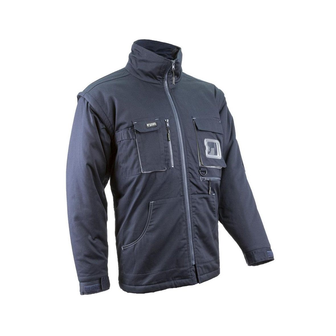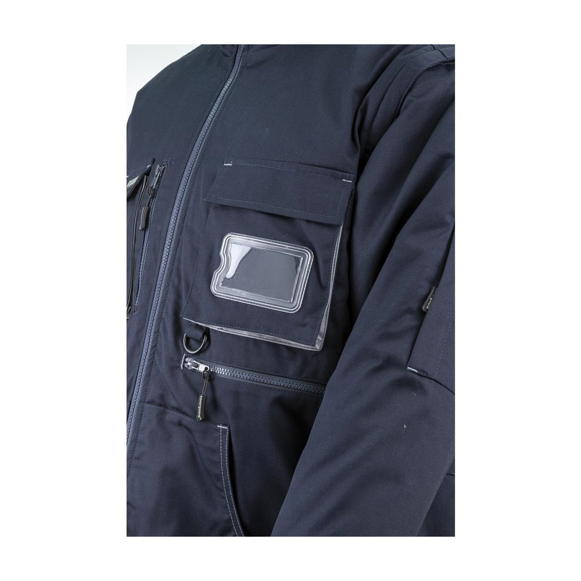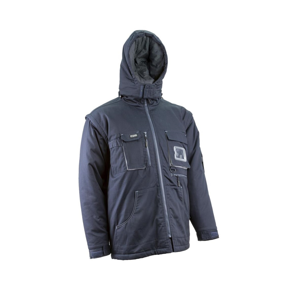 • 245 g/m2 vastag, 60% pamut+40% poliészter kevert szálas sávolykötésű alapanyag • melegbélés: 220 g/m2 vastag, 100% poliészter • belső bélés: 110 g/m2 vastag 80% pamut és 20% poliészter • hideg elleni minősítéssel • sötétkék kabát szürke színű kontraszt betétekkel • bélelt levehető kapucni • az álló gallér tetejéig húzódó cipzár • levehető ujjak és tépőzárral állítható mandzsetta • 2 rátétes oldalzseb • 1 felső zseb többrekeszes kiegészítéssel • 1 felső zseb névkártya tartóval • egy vízszintes cipzáros zseb bal oldalon • egy tolltartós zseb a ball ujjon • egy kitűző-tartó gyűrű • egy függőleges cipzáras paszpól zseb; Csomagolás: 1/10